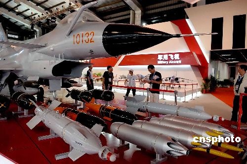 11月4日,第七屆中國國際航空航天博覽會開幕,倍受關(guān)注的中國“殲十”殲擊機(jī)首次亮相,并做飛行表演。圖為展館展示“殲十”殲擊機(jī)所攜彈頭 。中新社發(fā) 陳文 攝