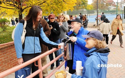 在臨近華盛頓的弗吉尼亞阿靈頓郡中心圖書館投票站,很多選民因?yàn)槠鸬迷,沒有吃早飯,此時(shí)來了兩位送餅干和熱咖啡的?墒,這兩位開口就問:你是奧巴馬的投票者么?一位女士說“Yes!”,于是馬上咖啡餅干免費(fèi)奉上。中新社發(fā) 邱江波 攝