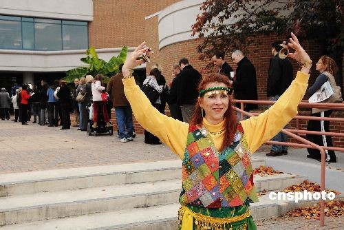 在臨近華盛頓的弗吉尼亞阿靈頓郡中心圖書館投票站,舞蹈家伊拉納在選民長隊(duì)前翩翩起舞,呼吁人們把票投給奧巴馬,她說,這樣才能夠讓美國重新贏得世界各國人民的尊重。圖為伊拉納載歌載舞拉選票。中新社發(fā) 邱江波 攝