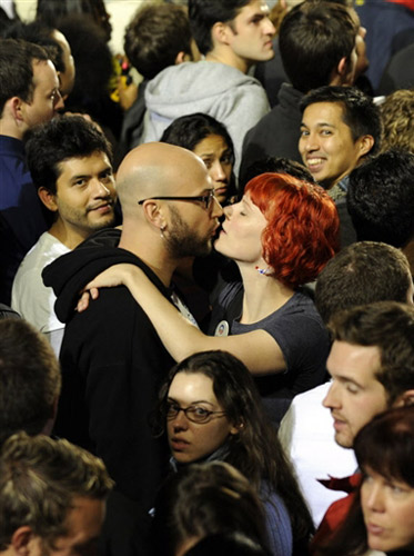一對(duì)情侶在集會(huì)中還不忘秀一下自己的愛情。