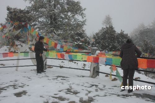 深秋季節(jié),四川甘孜藏族自治州高海拔地區(qū)普降大雪。圖為被譽為“中國最后的香格里拉”——四川稻城縣內(nèi),當?shù)夭孛裾谘┑刂袙忑堖_祈禱吉祥。中新社發(fā) 肖龍聯(lián) 攝
