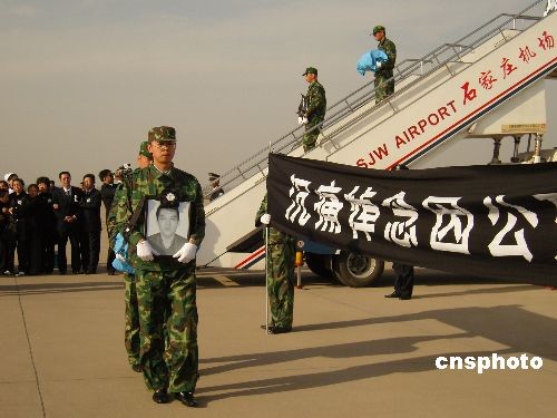 圖為工作人員護(hù)送5名遇難中國工人的遺像和骨灰走下飛機(jī)。