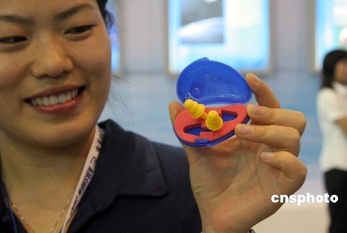兩年一度的珠海航展已盛裝開幕,一大批新研制的航空航天產(chǎn)品精彩亮相,備受觀眾關(guān)注。由中國航天員科研訓(xùn)練中心研制、注冊商標(biāo)為“神舟五號”的防護(hù)耳塞首次亮相航展,“神舟”五號、六號、七號航天員執(zhí)行任務(wù)時均使用過這種防護(hù)耳塞。圖為參展商工作人員向人們展示“神舟五號”防護(hù)耳塞。中新社發(fā) 孫自法 攝