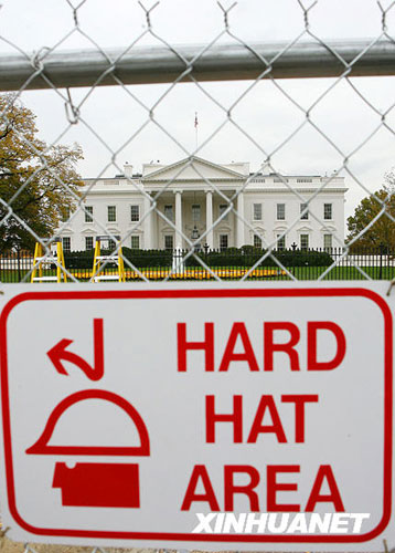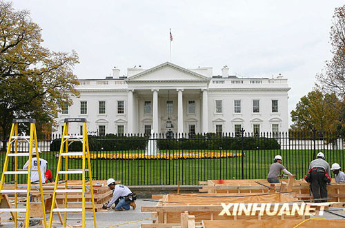 11月5日,在美國(guó)首都華盛頓,建筑工人在白宮北門(mén)搭建觀禮臺(tái)。已當(dāng)選下屆美國(guó)總統(tǒng)的奧巴馬2009年1月在國(guó)會(huì)宣誓就職后,將在這里舉行慶祝儀式。白宮、國(guó)會(huì)等處目前正在進(jìn)行新總統(tǒng)就職典禮的搭臺(tái)施工,準(zhǔn)備迎接奧巴馬宣誓就職。新華社記者 侯俊 攝