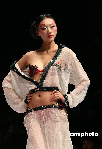 2008年11月5日,中國(guó)國(guó)際時(shí)裝周(2009春夏系列發(fā)布)開幕式——2008中華內(nèi)衣元素創(chuàng)新設(shè)計(jì)大賽在北京舉行。 本次大賽共收到全國(guó)27個(gè)地區(qū)(包括港澳臺(tái))和英國(guó)、日本的872組參賽作品,經(jīng)過評(píng)委的認(rèn)真評(píng)選,來自中國(guó)內(nèi)地、中國(guó)臺(tái)灣、英國(guó)和日本的24組參賽作品入圍。來自不同國(guó)家和地區(qū)的選手們從各個(gè)角度對(duì)漢代文化進(jìn)行各自的詮釋,將漢代文化的多元與繁榮表現(xiàn)地淋漓盡致。中新社發(fā) 魯谷 攝