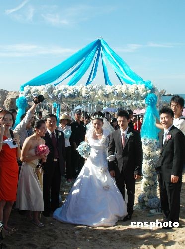 11月6日,2008北京奧運會體操“全能王”在海南三亞著名的天涯海角景區(qū)的愛情廣場的沙灘上舉行盛大浪漫的婚禮,與新娘楊云經(jīng)過8年的愛情長跑,終于走進婚姻的殿堂。楊威和新娘楊云登上熱氣球,演繹空中浪漫。中新社發(fā) 尹海明 攝