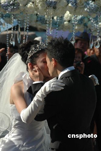 圖為雙方交換新婚戒指后,楊威在婚禮上激吻新娘楊云,演繹極度浪漫。中新社發(fā) 尹海明 攝
