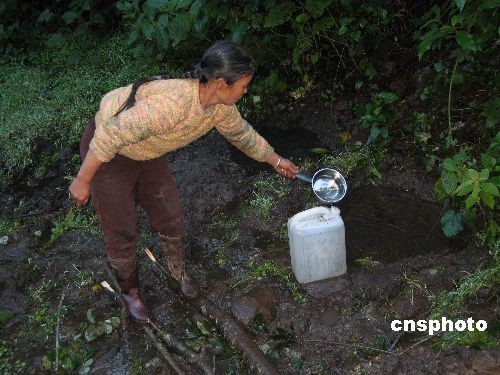 11月2日凌晨,云南楚雄發(fā)生泥石流災害。受災最為嚴重的楚雄市西舍路鄉(xiāng)新華村大路邊小組的320名村民臨時轉移至距災害現(xiàn)場兩公里的大光山上,但因交通中斷,救援物資很難運進災區(qū),民眾只能到附近的山谷的小水潭中打水。圖為一位災民到山谷中打水,以解決暫時吃水困難問題。