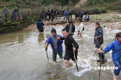 11月2日,云南楚雄發(fā)生泥石流災(zāi)害,多條進(jìn)入災(zāi)區(qū)的道路塌方中斷。楚雄州市官員徒步17個小時進(jìn)入災(zāi)區(qū)一線,指揮救援工作。圖為楚雄市市長袁鵬(圖正中者)赤腳淌水過河,步行7個半小時從災(zāi)區(qū)返城布置下一步的救援工作安排。他表示,隨著道路搶修里程增加,大量的救援物資將陸續(xù)運(yùn)入災(zāi)區(qū),保證不讓一位災(zāi)民在寒冷中過冬。