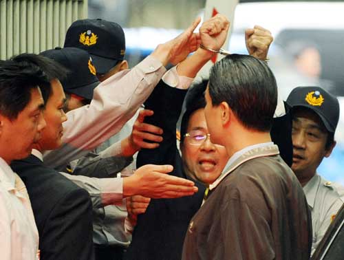 臺(tái)灣檢方特偵組偵辦機(jī)要費(fèi)案及陳水扁家庭疑洗錢案,11月11日第五度以被告身份傳喚陳水扁到案說(shuō)明。經(jīng)過(guò)6個(gè)多小時(shí)的偵訊后,陳水扁被檢方聲請(qǐng)羈押禁見(jiàn),并銬上手銬,移送到臺(tái)北地方法院開(kāi)羈押庭,等待法官裁決是否要收押。
