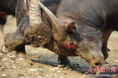 11月11日,貴州雷山縣苗族同胞迎來了一年一度的苗年節(jié),在雷山縣城河灘上,苗族同胞舉行斗牛斗豬比賽歡度苗年節(jié)。圖為兩頭水牛在比賽中。(吳東。