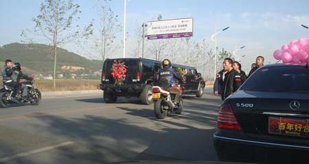 加長(zhǎng)悍馬頭車(chē)后面是新款千禧奔100輛。
