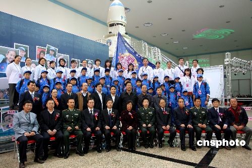 中國航天員楊利偉、費(fèi)俊龍、聶海勝出席開營儀式與營員合影。中新社發(fā) 盛佳鵬 攝