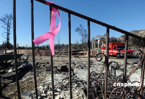 十一月十八日,洛杉磯北部希爾瑪市的一個居民區(qū)在大火中幾乎被焚毀,整個社區(qū)六百零八間住宅中的四百八十間蕩然無存。中新社發(fā) 張煒 攝