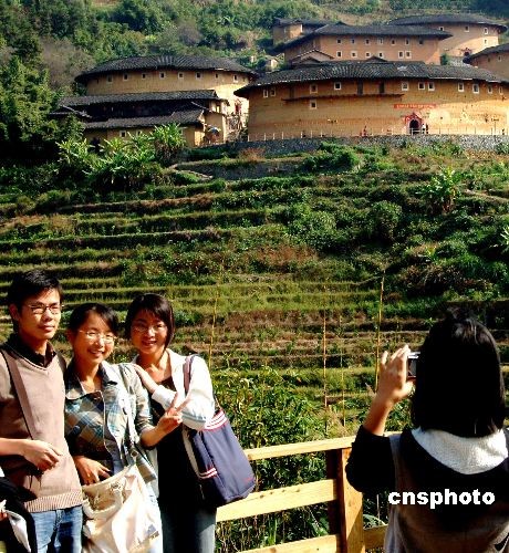 11月19日,來自外地的游客慕名來到漳州南靖縣田螺坑土樓群前流連忘返。自二00八月七月福建土樓被列入《世界文化遺產(chǎn)名錄》至今,到漳州南靖縣旅游觀光的中外游客已達(dá)逾46 萬人次,創(chuàng)旅游收入12980萬元人民幣。
