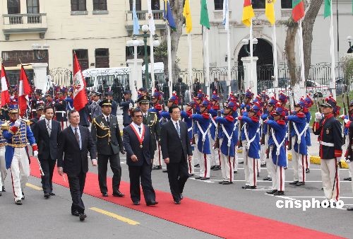 當(dāng)?shù)貢r(shí)間11月20日,中國國家主席胡錦濤在秘魯國會(huì)大廈前檢閱秘魯三軍儀仗隊(duì)。中新社發(fā) 齊彬 攝