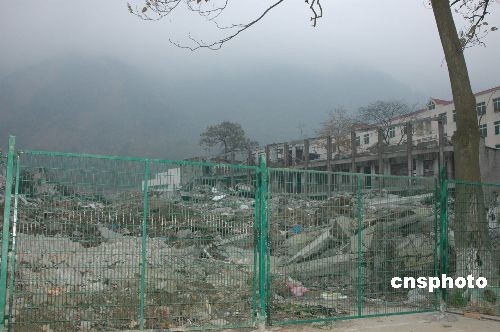 為尊重遇難學生的家長意見,避免參觀者踩在逝者長眠之地,11月21日,北川中學地震遺址前正在加裝綠色的圍欄。中新社發(fā) 肖龍聯(lián) 攝