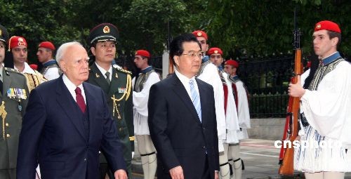 希臘總統(tǒng)帕普利亞斯二十四日下午在總統(tǒng)府舉行儀式,歡迎中國(guó)國(guó)家主席胡錦濤訪問希臘。圖為胡錦濤在帕普利亞斯陪同下檢閱希臘國(guó)家儀仗隊(duì)。中新社發(fā) 吳衛(wèi)中 攝