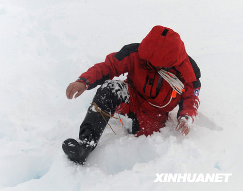 由于南極大陸周圍多年未化的“老冰”和剛剛結(jié)成的“新冰”混合一起,堵死了“雪龍”號前進(jìn)的航線,25日晚6時,“雪龍”號有關(guān)負(fù)責(zé)人決定由船上隊(duì)員組成探冰隊(duì)下船察看冰情。