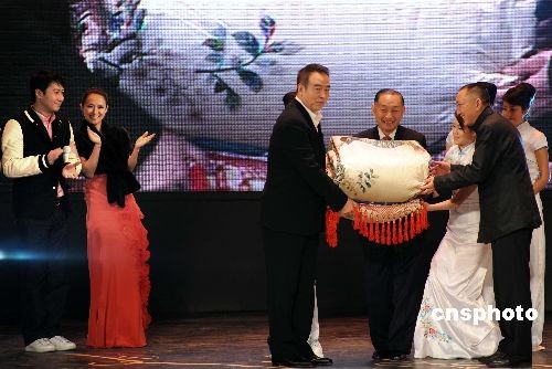 12月2日晚,陳凱歌執(zhí)導(dǎo)的電影《梅蘭芳》在北京中影懷柔影視基地舉行首映禮,片方陳凱歌、韓三平向梅蘭芳之子歸還其父使用過(guò)的“守舊”。梅葆玖曾將“守舊”借給《梅蘭芳》攝制組用于電影拍攝。中新社發(fā) 廖攀 攝