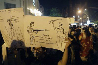 近萬名孟買市民3日晚上聚集到泰姬瑪哈酒店附近舉行游行示威,抗議政府反恐不力。