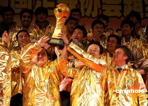 12月4日,2008中國足球協(xié)會超級聯(lián)賽頒獎典禮在山東濟(jì)南舉行。冠軍球隊(duì)山東魯能泰山全體將士登臺舉起火神杯。