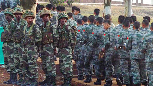 中國(guó)士兵列隊(duì)走過(guò)印度士兵。