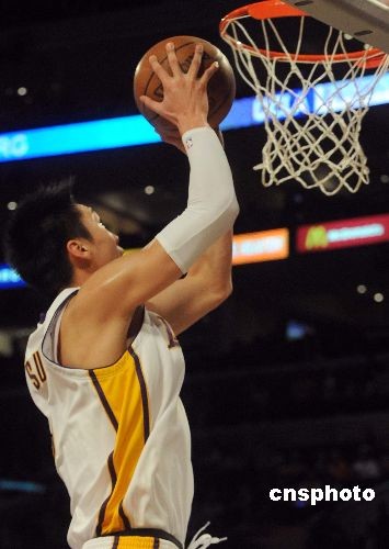 當(dāng)?shù)貢r(shí)間十二月七日晚,NBA洛杉磯湖人隊(duì)在主場(chǎng)以一百零五比九十二輕取雄鹿隊(duì),中國(guó)球員孫悅首度在NBA常規(guī)賽上登場(chǎng),共取得四分。圖為孫悅上籃得分。中新社發(fā) 張煒 攝