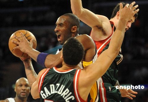 當(dāng)?shù)貢r(shí)間十二月七日晚,NBA洛杉磯湖人隊(duì)在主場以一百零五比九十二輕取雄鹿隊(duì)。其中湖人后衛(wèi)科比·布萊恩特上場三十一分鐘,奪得二十分。中新社發(fā) 張煒 攝