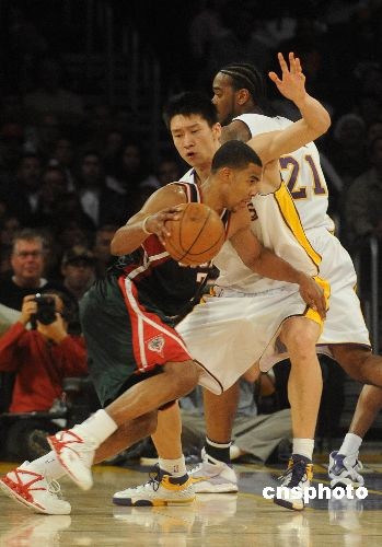 洛杉磯湖人隊在主場以一百零五比九十二輕取雄鹿隊,中國球員孫悅首度在NBA常規(guī)賽上登場。圖為孫悅積極防守。中新社發(fā) 張煒 攝
