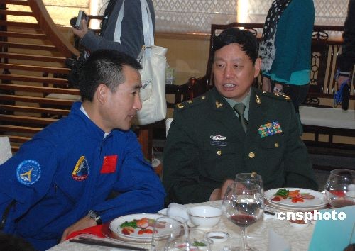 圖為駐澳門部隊司令員王玉仁在歡迎午宴上與航天英雄翟志剛交談。中新社發(fā) 畢永光 攝