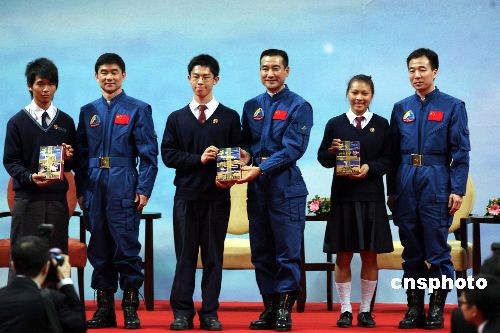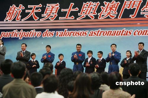 圖為翟志剛、劉伯明、景海鵬三位航天員向澳門學(xué)子贈送禮物。中新社發(fā) 武仲林 攝
