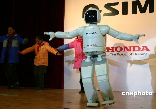 12月9日,目前世界上最先進(jìn)的類人型機(jī)器人ASIMO在四川都江堰進(jìn)行系列節(jié)目表演,拉開“ASIMO中國(guó)行”系列活動(dòng)的序幕。圖為ASIMO與當(dāng)?shù)睾⒆颖荣悊瓮泉?dú)立。中新社發(fā) 黃永莉 攝