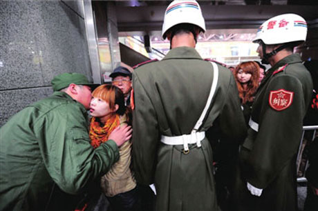 一名新兵與家人耳語道別。10日下午,北京今冬第一批450名新兵在北京西站啟程,乘坐T579次列車奔赴石家莊等地軍營。張斌 攝(圖片來源:京華時(shí)報(bào))