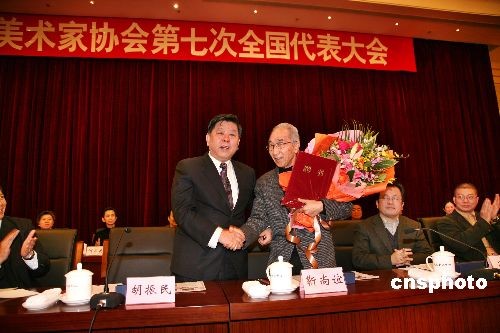 中國文聯(lián)黨組書記、副主席胡振民給新當(dāng)選的中國美協(xié)榮譽(yù)主席靳尚誼頒發(fā)聘書。中新社發(fā) 王保勝 攝