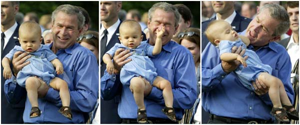 在白宮傳統(tǒng)的一年一度夏季野餐會(huì)上,美國總統(tǒng)布什在逗玩國會(huì)議員的兒子。