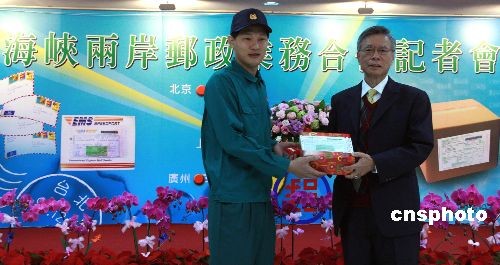 12月15日上午9時(shí)15分,臺(tái)灣“中華郵政”董事長(zhǎng)吳民佑(右)將臺(tái)灣直接通郵寄往大陸的第一份郵件交到郵遞員手中。