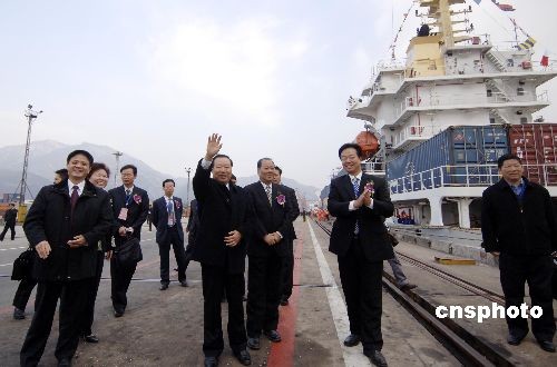 海峽兩岸關(guān)系協(xié)會副會長王在希以及福建省相關(guān)領(lǐng)導(dǎo)在福州青洲港區(qū)揮手送別承擔(dān)兩岸海上直航首航任務(wù)的船員。