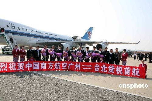 由中國南方航空股份有限公司執(zhí)飛的兩岸首架直航貨運包機(jī),于十二月十五日下午十五時從廣州白云國際機(jī)場起飛,預(yù)計飛行一小時四十五分鐘后降落臺北桃園機(jī)場。 該架貨機(jī)型為目前世界上最先進(jìn)、最大型的波音七四七-四零零F全貨機(jī)。中新社發(fā) 羅廣泰 攝
