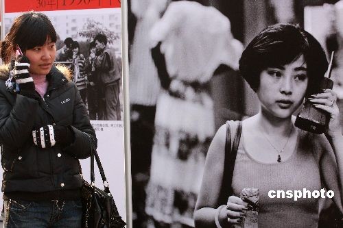 圖為“民生記憶30年”再現(xiàn)改革開放30年來市民手機消費的變化,完美演繹“手機改革史”。中新社發(fā) 鄭雄增 攝