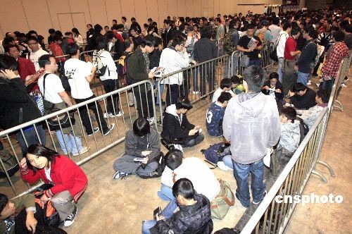 十二月十九日,一年一度的“亞洲游戲展2008”在香港會展中心舉行。圖為游戲迷們早早來到門口排隊等候進場。中新社發(fā) 張勤 攝