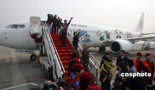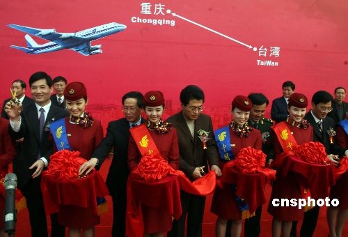 12月19日,重慶至臺(tái)北的直航航線正式開(kāi)通。當(dāng)日下午3時(shí)許,印有福娃圖案的國(guó)航班機(jī)從重慶江北機(jī)場(chǎng)起飛,駛向?qū)殟u臺(tái)灣。中新社發(fā) 郭晉嘉 攝