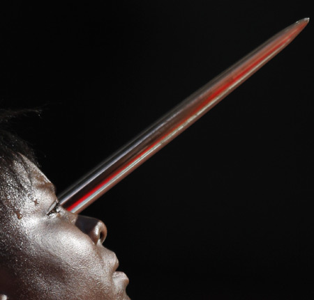 北京奧運會的標(biāo)槍比賽中,肯尼亞運動員Nakhumicha Zakayo即將扔出手中的標(biāo)槍。