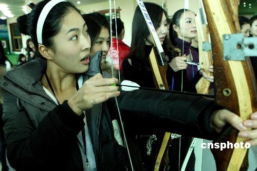 12月23日,正在北京參加2008世界亞裔小姐大賽中國區(qū)總決賽的佳麗在嘉年華游樂園里興高采烈游樂健身,圖為參賽佳麗練習(xí)射箭。中新社發(fā) 錢興強 攝