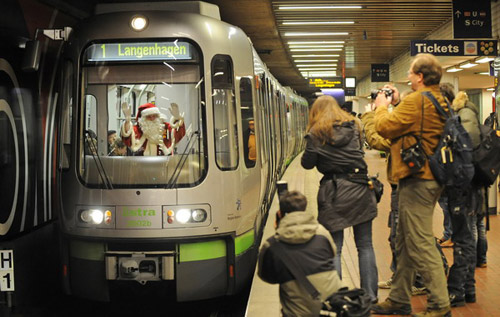 在德國(guó)漢諾威的一個(gè)地鐵站,裝扮成圣誕老人模樣的列車司機(jī)向站臺(tái)上的人們招手。