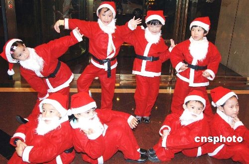 圣誕平安夜,八位小朋友裝扮成圣誕老人,在福州一場(chǎng)圣誕平安夜晚會(huì)上擺出可愛(ài)的造型,歡度平安夜。中新社發(fā) 劉可耕 攝