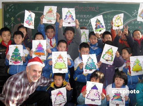 12月24日,河北邢臺雙語小學的孩子們,與在邢臺工作的加拿大籍友人羅杰一同慶祝圣誕節(jié),在祝福外國友人節(jié)日快樂的同時,還送上了親手制作的圣誕禮物。中新社發(fā) 陳雷 攝