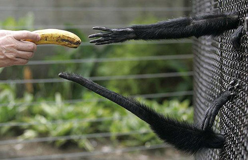 伸手索要食物的蜘蛛猿,贏得“最貪吃動(dòng)物”獎(jiǎng)。