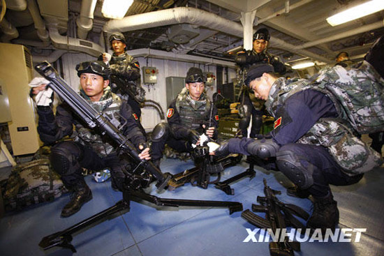 12月25日,海軍特戰(zhàn)隊員在軍艦艙室里擦拭武器。