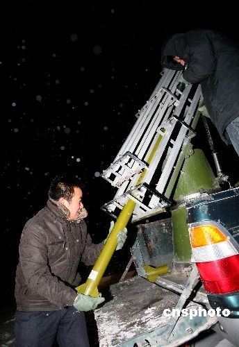 12月26日,新疆哈密人工增雪工作人員準備發(fā)射人工增雪火箭彈。